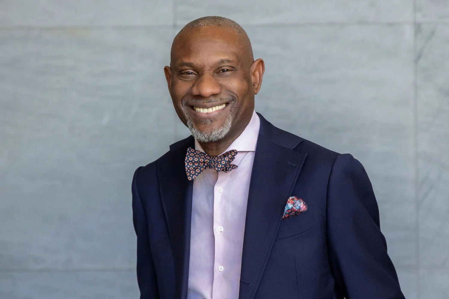 Don't forget to let your personality show. The bow tie is great. The light pink shirt under a navy jacket is a smart look.